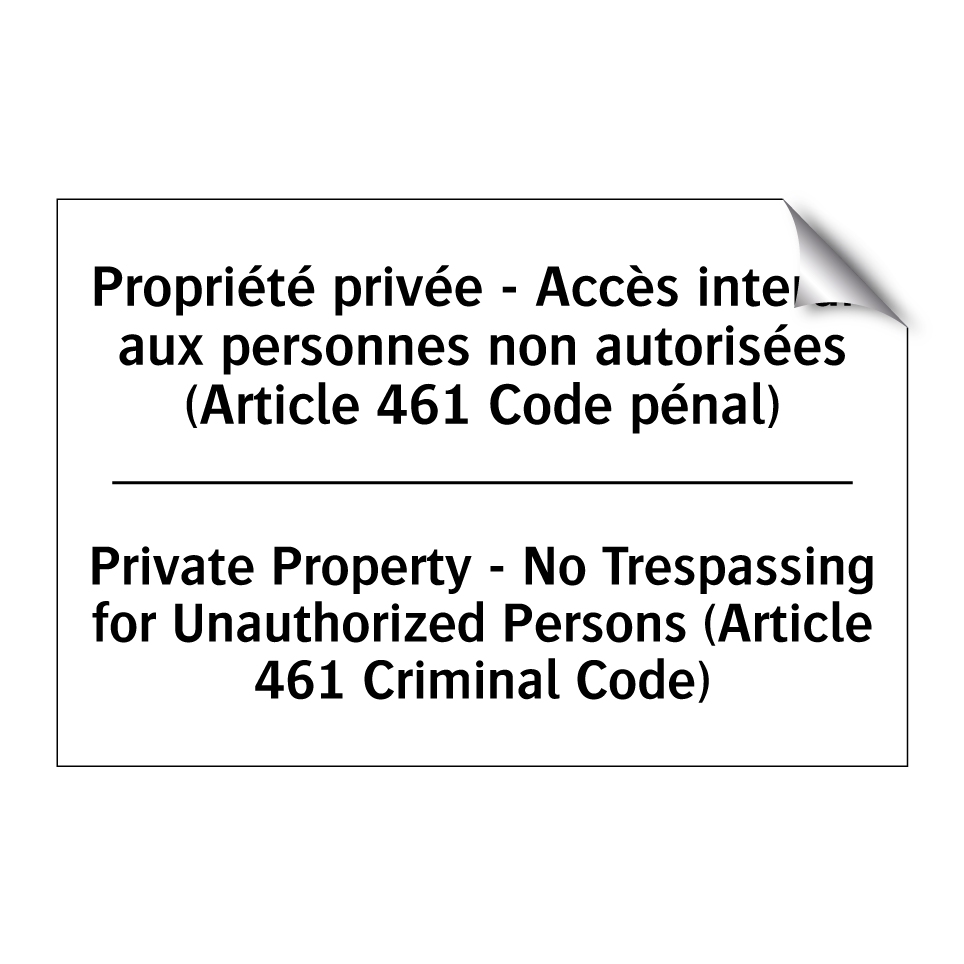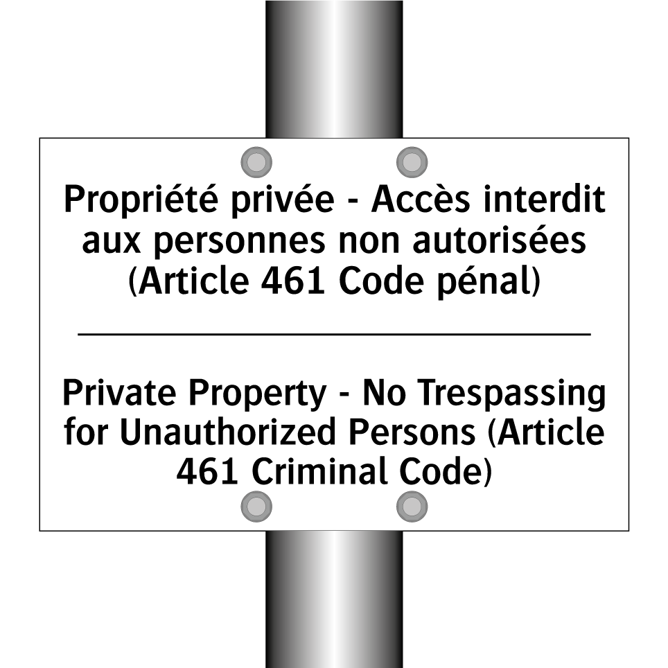 Panneau d'interdiction bilingue avec texte en français : "Propriété privée - Accès interdit aux personnes non autorisées (Article 461 Code pénal)", et en anglais : "Private Property - No Trespassing for Unauthorized Persons (Article 461 Criminal Code)"
