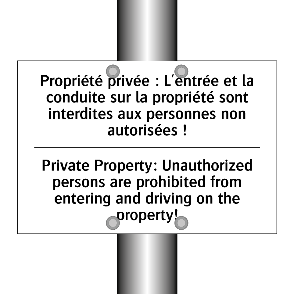 Panneau d'interdiction bilingue avec texte en français : "Propriété privée : L'entrée et la conduite sur la propriété sont interdites aux personnes non autorisées !", et en anglais : "Private Property: Unauthorized persons are prohibited from entering and driving on the property!"