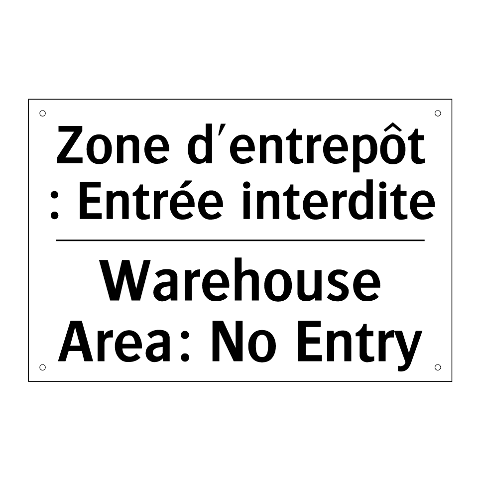 Panneau d'interdiction bilingue avec texte en français : "Zone d'entrepôt : Entrée interdite", et en anglais : "Warehouse Area: No Entry"