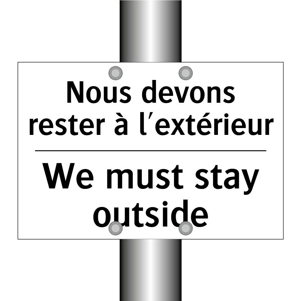 Panneau d'interdiction bilingue avec texte en français : "Nous devons rester à l'extérieur", et en anglais : "We must stay outside"