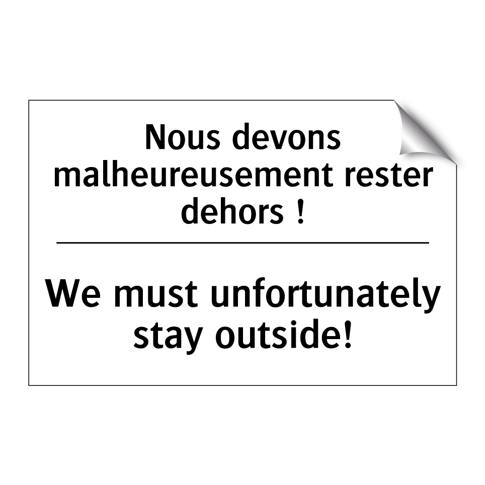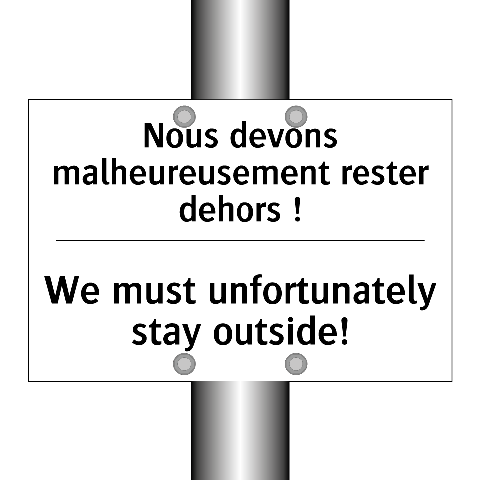 Panneau d'interdiction bilingue avec texte en français : "Nous devons malheureusement rester dehors !", et en anglais : "We must unfortunately stay outside!"