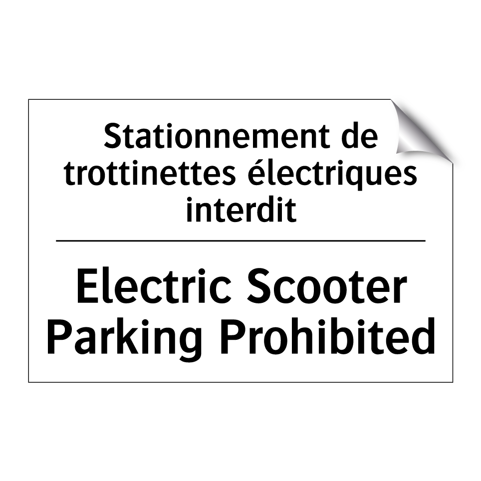 Panneau d'interdiction bilingue avec texte en français : "Stationnement de trottinettes électriques interdit", et en anglais : "Electric Scooter Parking Prohibited"