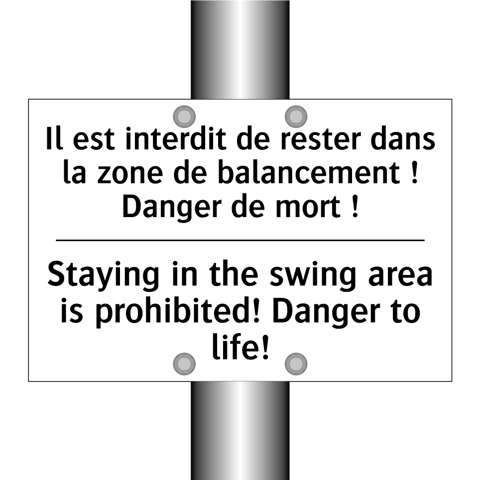 Panneau d'interdiction bilingue avec texte en français : "Il est interdit de rester dans la zone de balancement ! Danger de mort !", et en anglais : "Staying in the swing area is prohibited! Danger to life!"