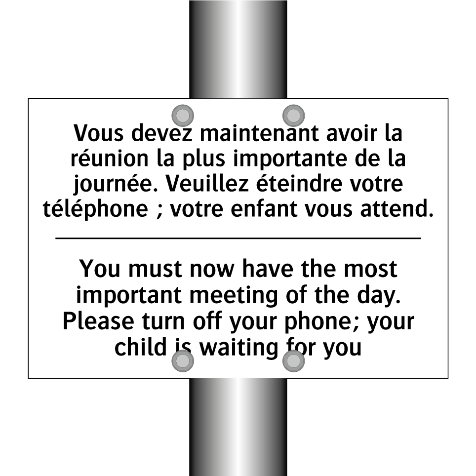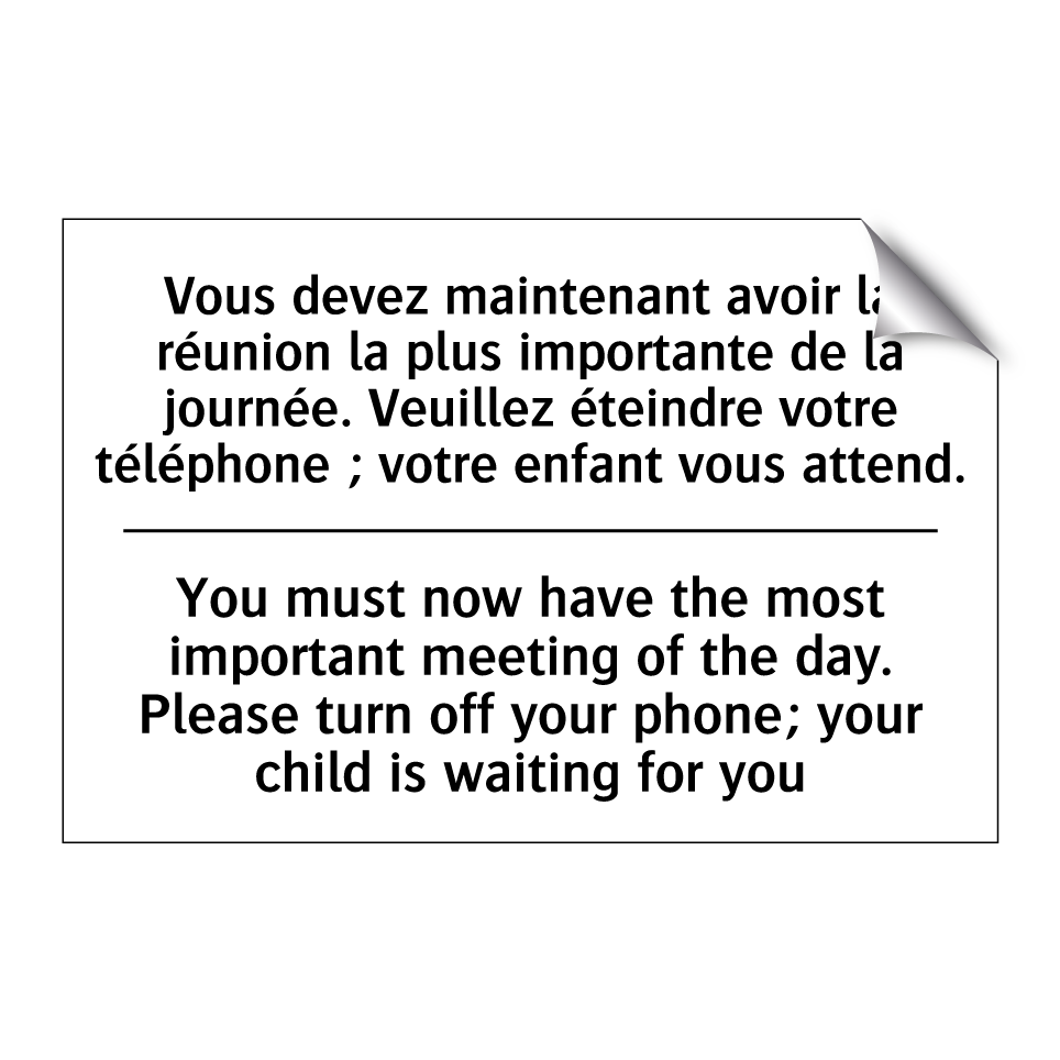 Panneau d'interdiction bilingue avec texte en français : "Vous devez maintenant avoir la réunion la plus importante de la journée. Veuillez éteindre votre téléphone ; votre enfant vous attend.", et en anglais : "You must now have the most important meeting of the day. Please turn off your phone; your child is waiting for you"