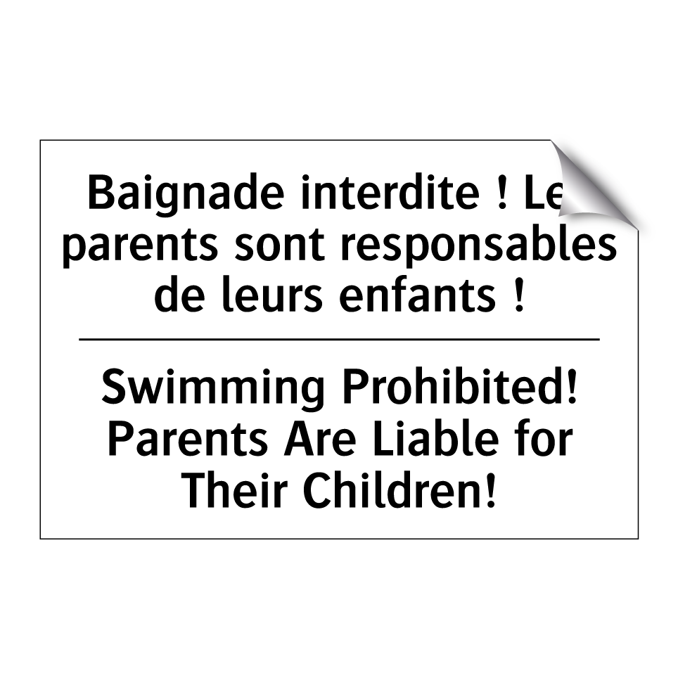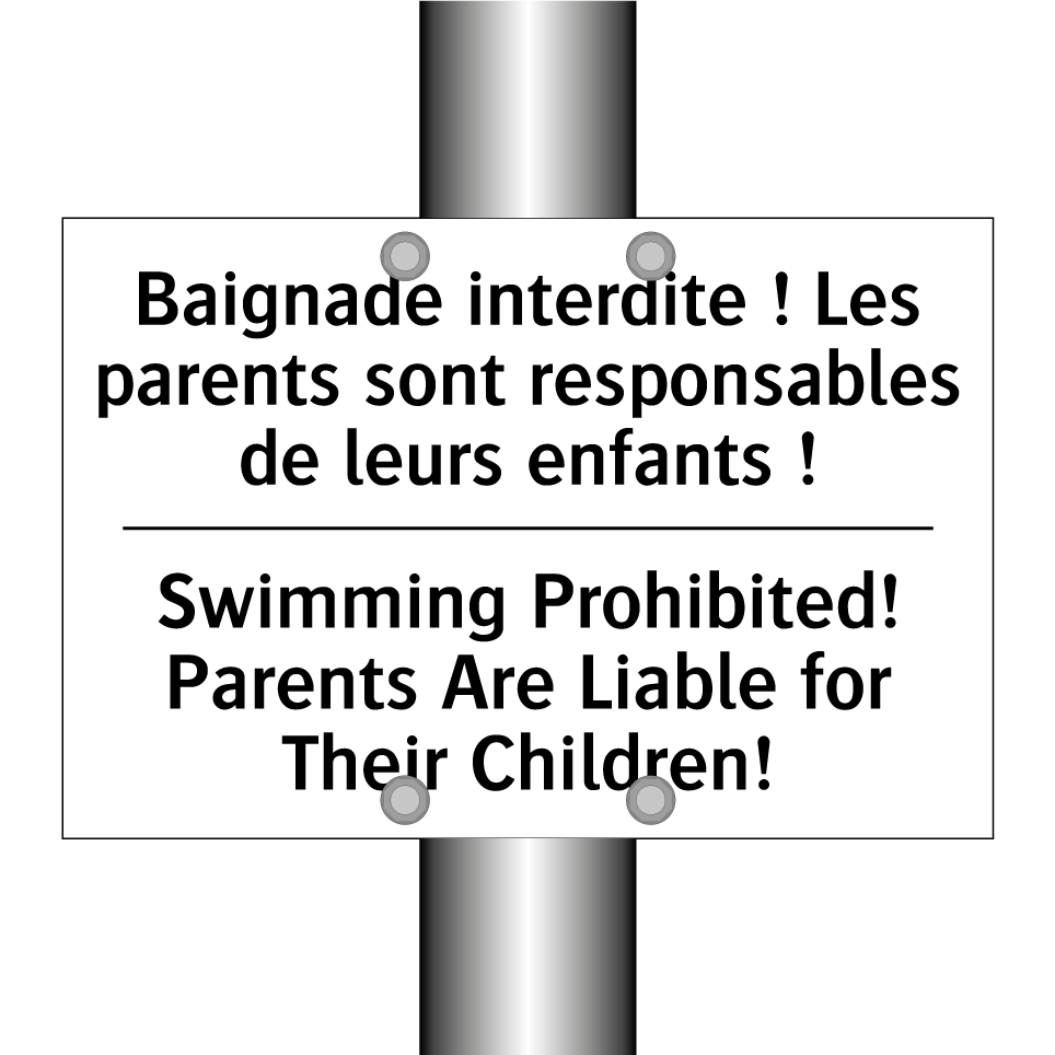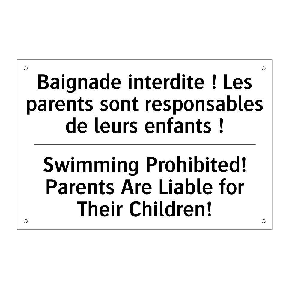 Panneau d'interdiction bilingue avec texte en français : "Baignade interdite ! Les parents sont responsables de leurs enfants !", et en anglais : "Swimming Prohibited! Parents Are Liable for Their Children!"