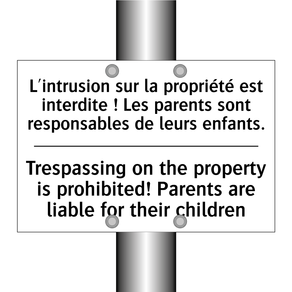 Panneau d'interdiction bilingue avec texte en français : "L'intrusion sur la propriété est interdite ! Les parents sont responsables de leurs enfants.", et en anglais : "Trespassing on the property is prohibited! Parents are liable for their children"
