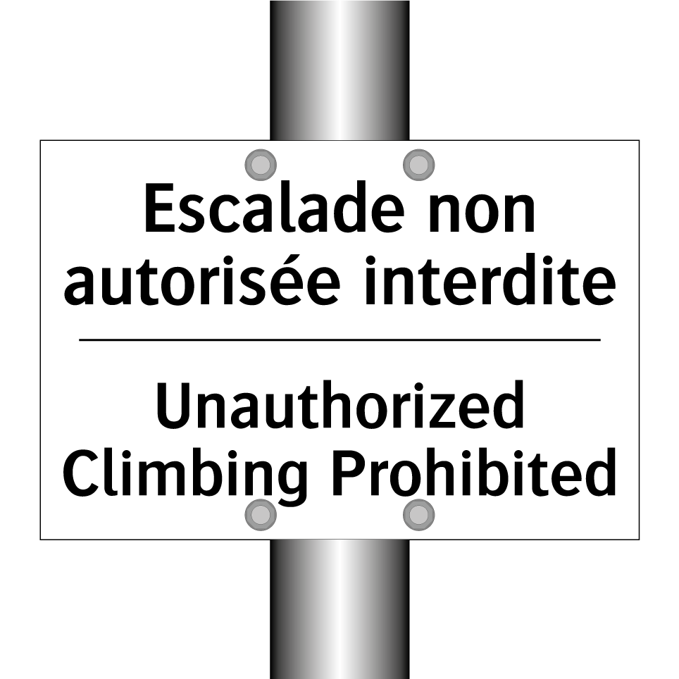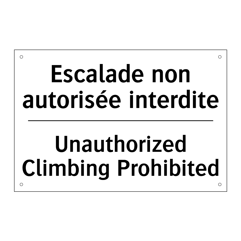 Panneau d'interdiction bilingue avec texte en français : "Escalade non autorisée interdite", et en anglais : "Unauthorized Climbing Prohibited"