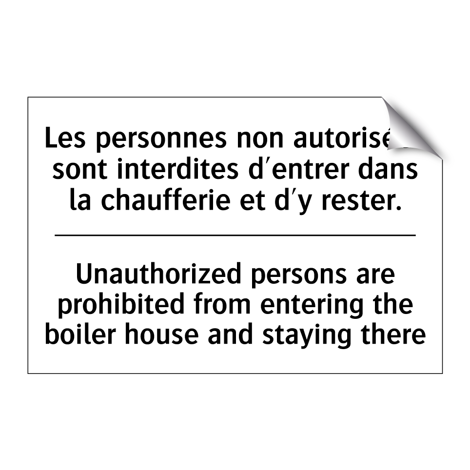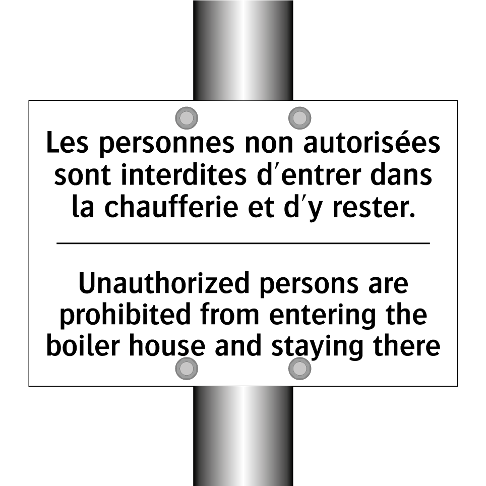 Panneau d'interdiction bilingue avec texte en français : "Les personnes non autorisées sont interdites d'entrer dans la chaufferie et d'y rester.", et en anglais : "Unauthorized persons are prohibited from entering the boiler house and staying there"