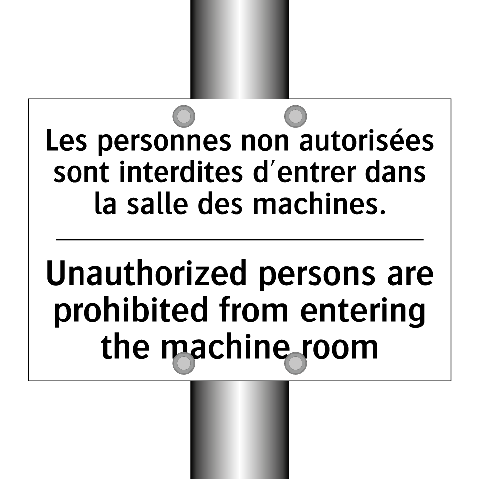 Panneau d'interdiction bilingue avec texte en français : "Les personnes non autorisées sont interdites d'entrer dans la salle des machines.", et en anglais : "Unauthorized persons are prohibited from entering the machine room"