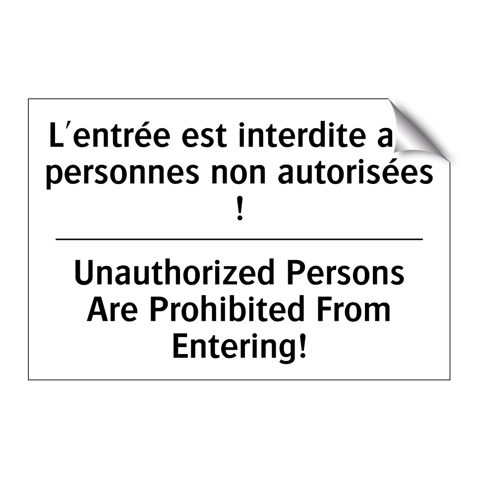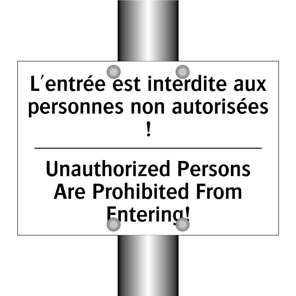 Panneau d'interdiction bilingue avec texte en français : "L'entrée est interdite aux personnes non autorisées !", et en anglais : "Unauthorized Persons Are Prohibited From Entering!"
