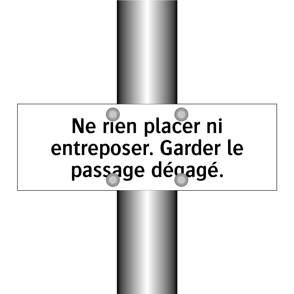 Panneau d'interdiction avec le texte : "Ne rien placer ni entreposer. Garder le passage dégagé."