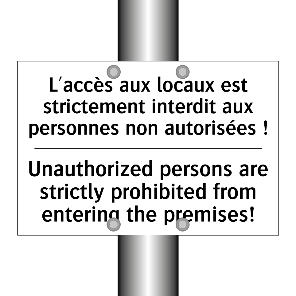 Panneau d'interdiction bilingue avec texte en français : "L'accès aux locaux est strictement interdit aux personnes non autorisées !", et en anglais : "Unauthorized persons are strictly prohibited from entering the premises!"