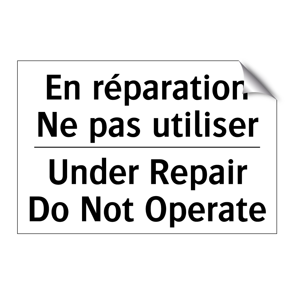 Panneau d'interdiction bilingue avec texte en français : "En réparation Ne pas utiliser", et en anglais : "Under Repair Do Not Operate"