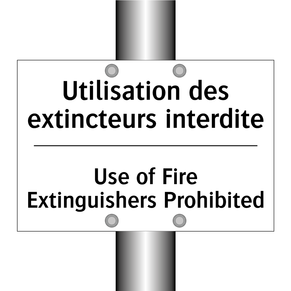 Panneau d'interdiction bilingue avec texte en français : "Utilisation des extincteurs interdite", et en anglais : "Use of Fire Extinguishers Prohibited"
