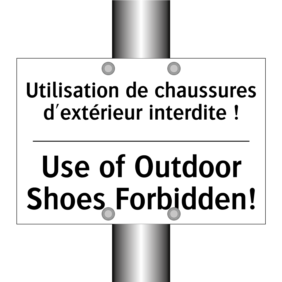 Panneau d'interdiction bilingue avec texte en français : "Utilisation de chaussures d'extérieur interdite !", et en anglais : "Use of Outdoor Shoes Forbidden!"