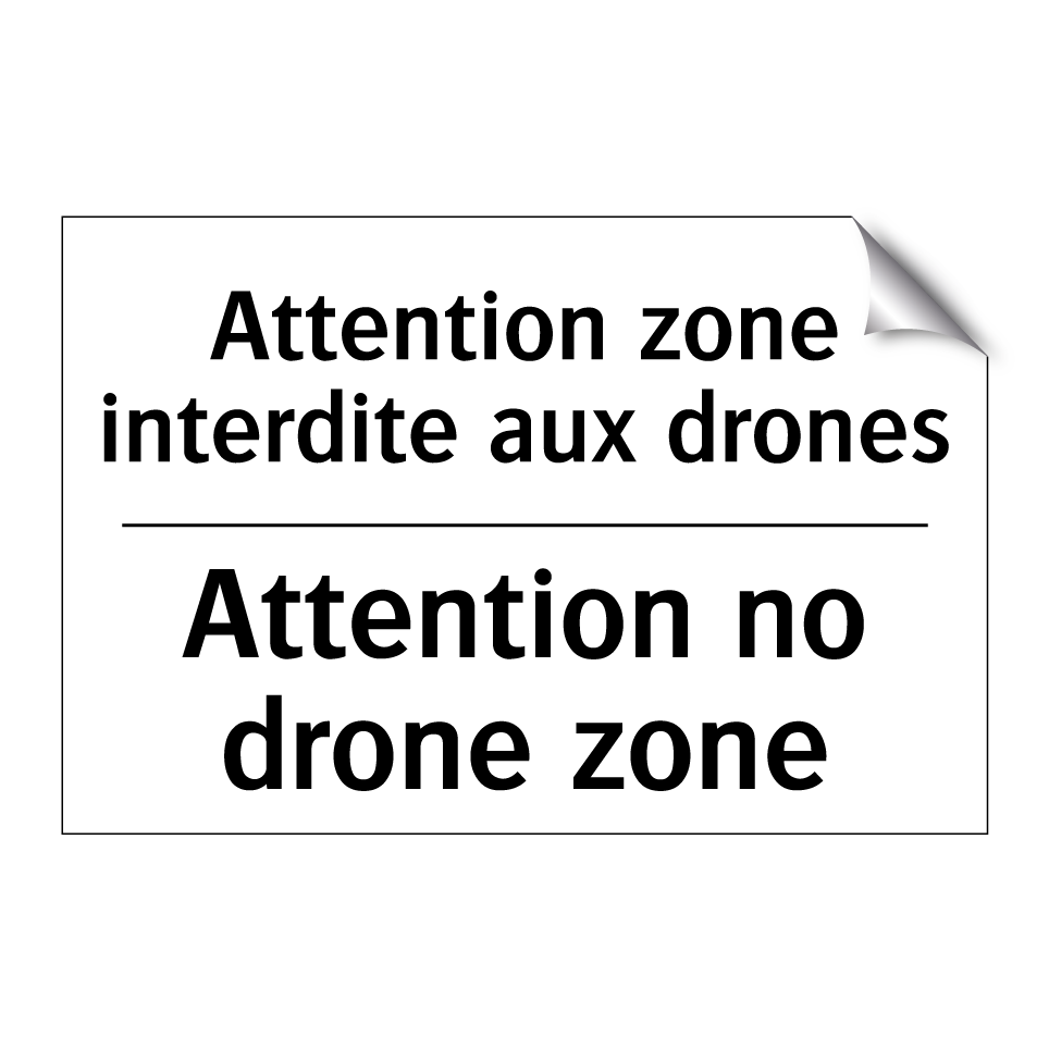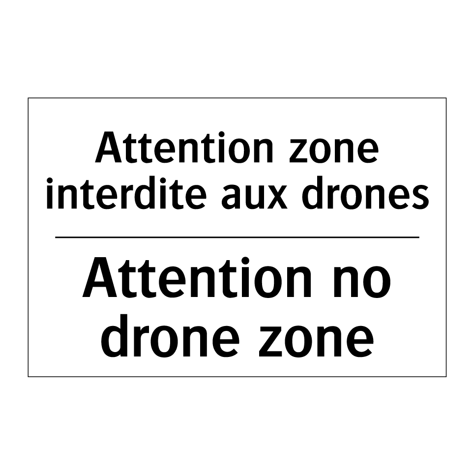 Panneau d'interdiction bilingue avec texte en français : "Attention zone interdite aux drones", et en anglais : "Attention no drone zone"