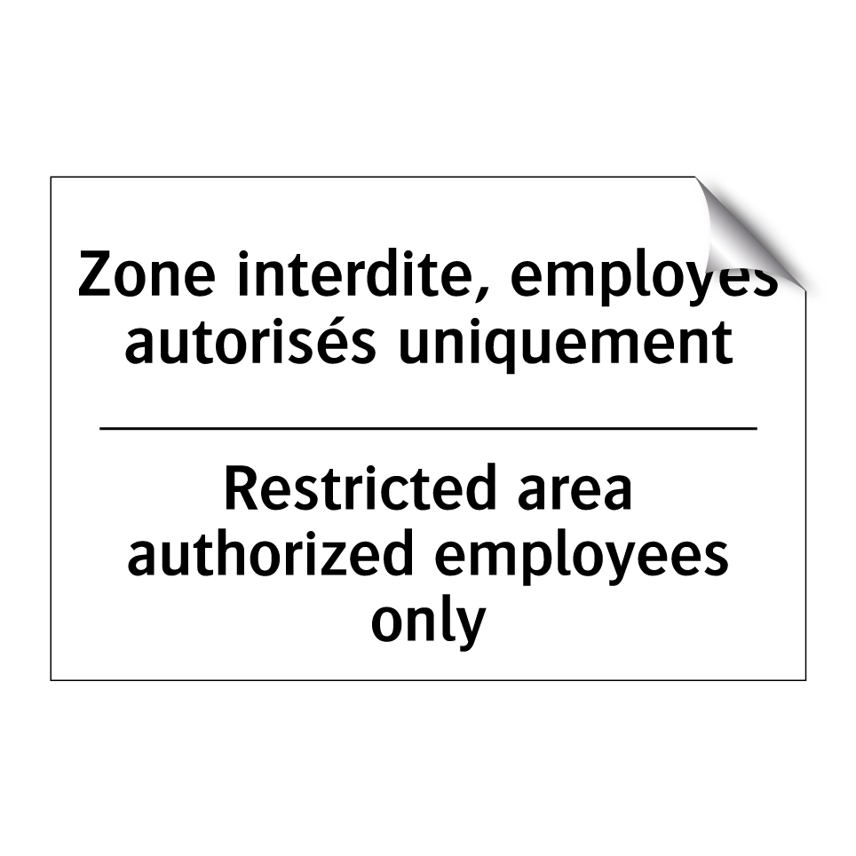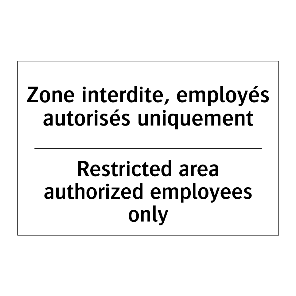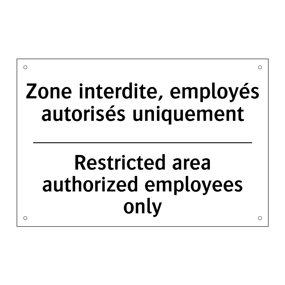 Panneau d'interdiction bilingue avec texte en français : "Zone interdite, employés autorisés uniquement", et en anglais : "Restricted area authorized employees only"