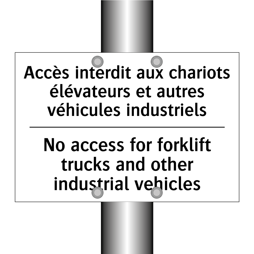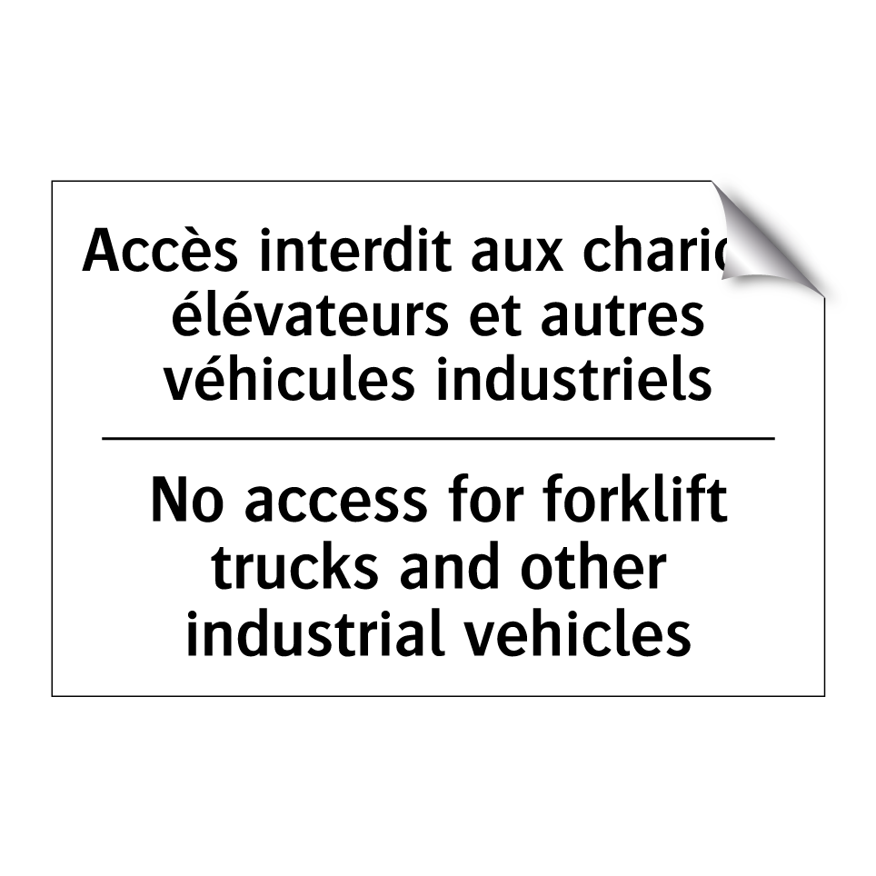Panneau d'interdiction bilingue avec texte en français : "Accès interdit aux chariots élévateurs et autres véhicules industriels", et en anglais : "No access for forklift trucks and other industrial vehicles"
