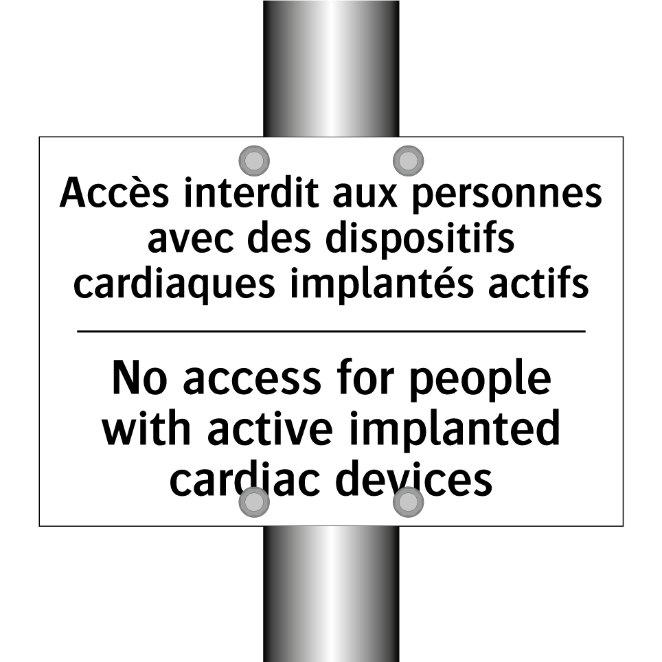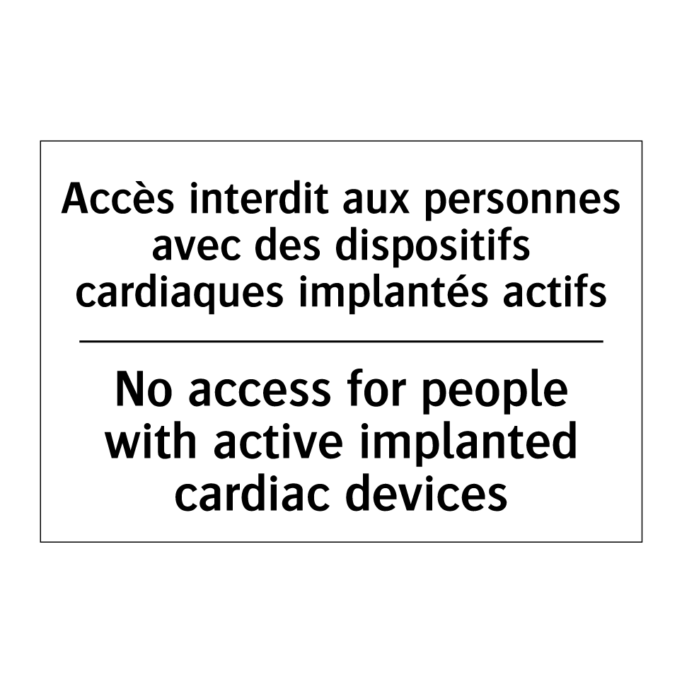 Panneau d'interdiction bilingue avec texte en français : "Accès interdit aux personnes avec des dispositifs cardiaques implantés actifs", et en anglais : "No access for people with active implanted cardiac devices"