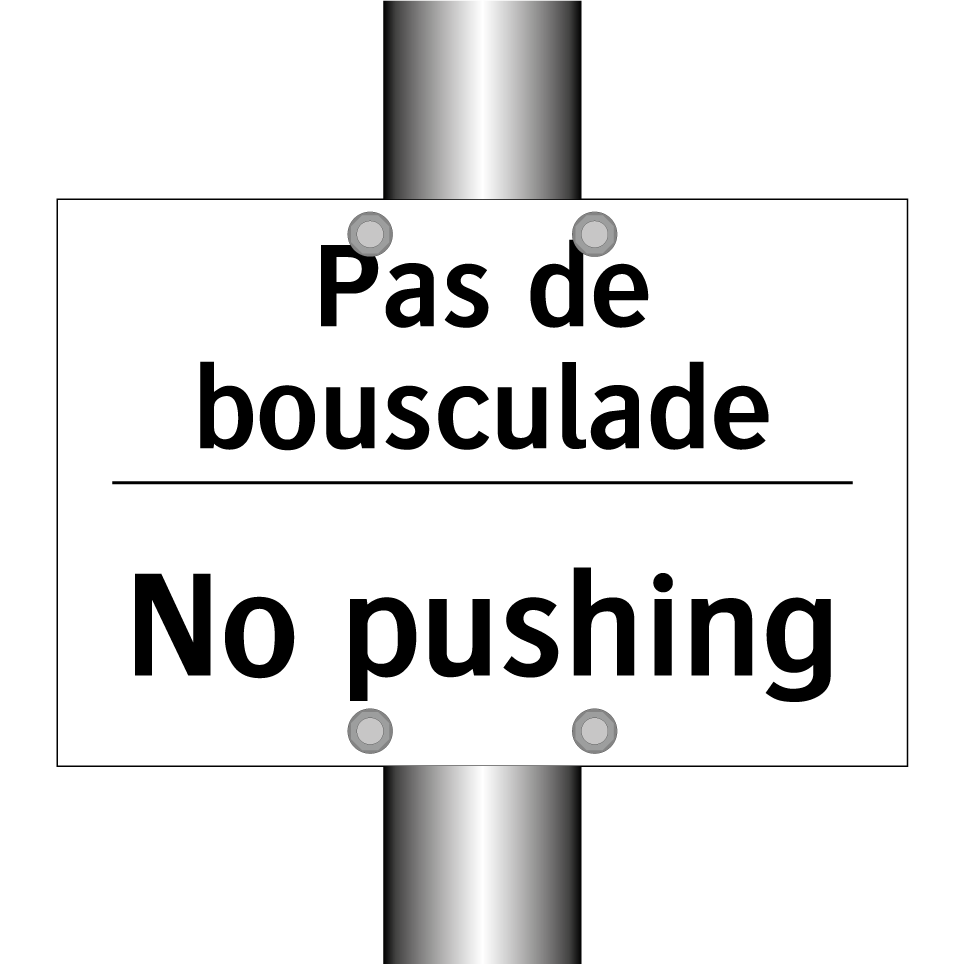 Panneau d'interdiction bilingue avec texte en français : "Pas de bousculade", et en anglais : "No pushing"