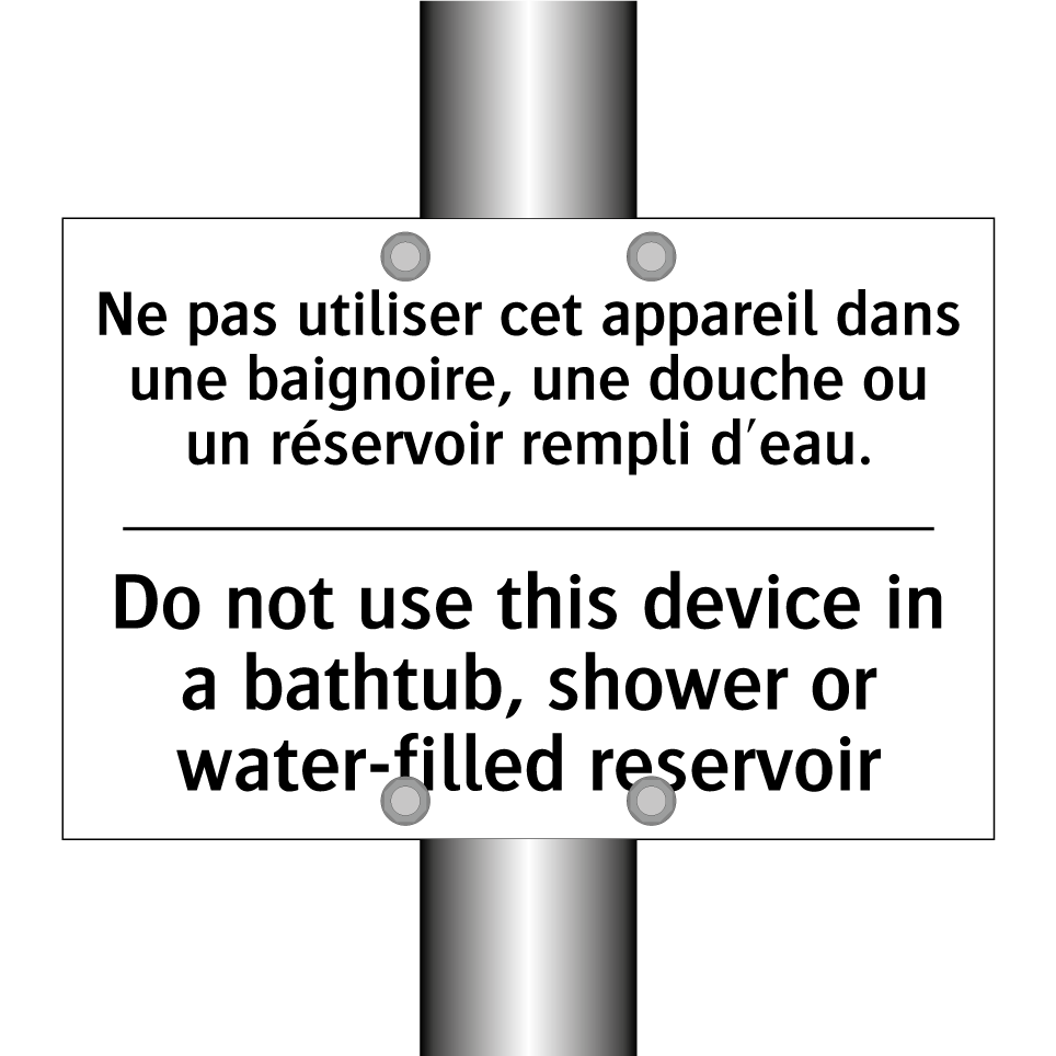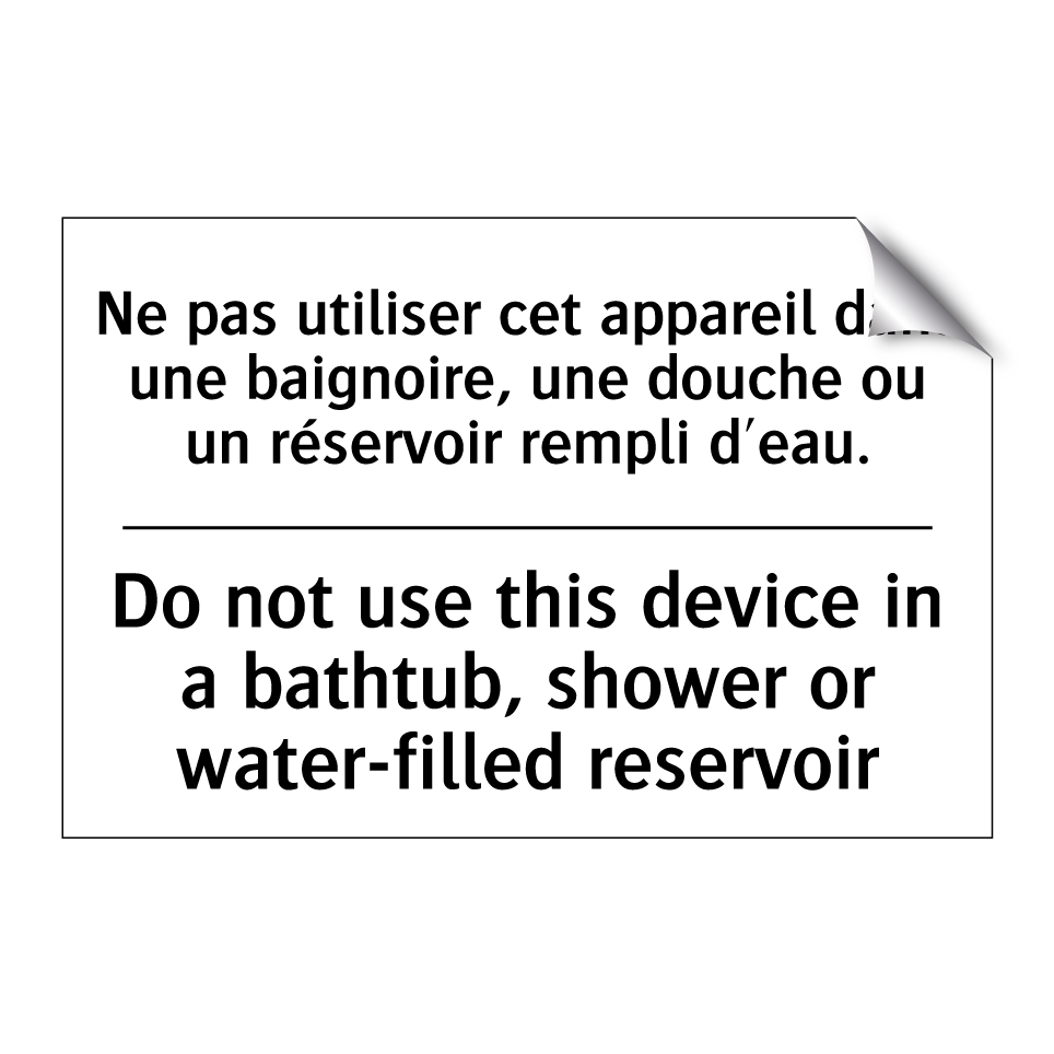 Panneau d'interdiction bilingue avec texte en français : "Ne pas utiliser cet appareil dans une baignoire, une douche ou un réservoir rempli d'eau.", et en anglais : "Do not use this device in a bathtub, shower or water-filled reservoir"