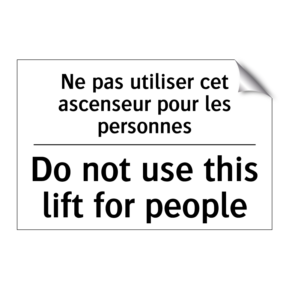 Panneau d'interdiction bilingue avec texte en français : "Ne pas utiliser cet ascenseur pour les personnes", et en anglais : "Do not use this lift for people"