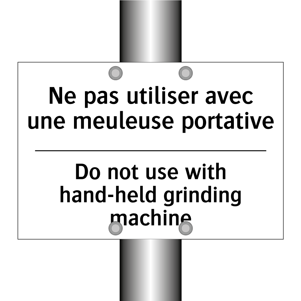 Panneau d'interdiction bilingue avec texte en français : "Ne pas utiliser avec une meuleuse portative", et en anglais : "Do not use with hand-held grinding machine"