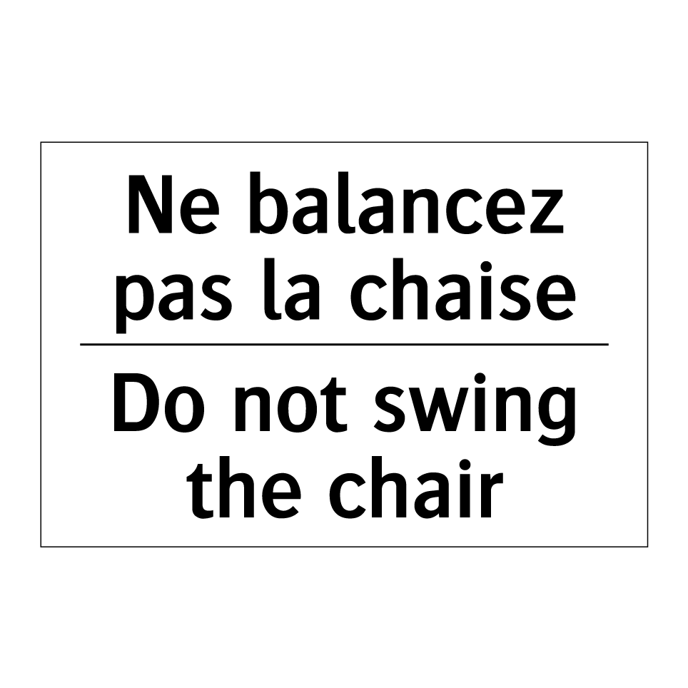 Panneau d'interdiction bilingue avec texte en français : "Ne balancez pas la chaise", et en anglais : "Do not swing the chair"