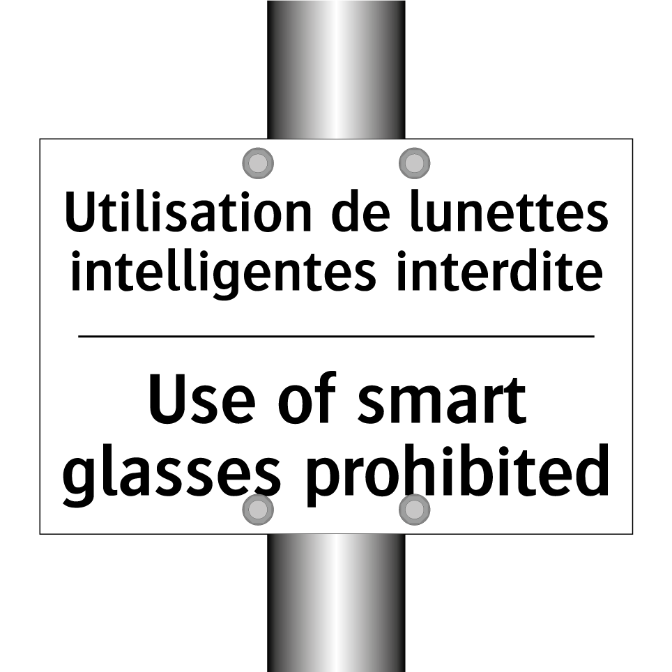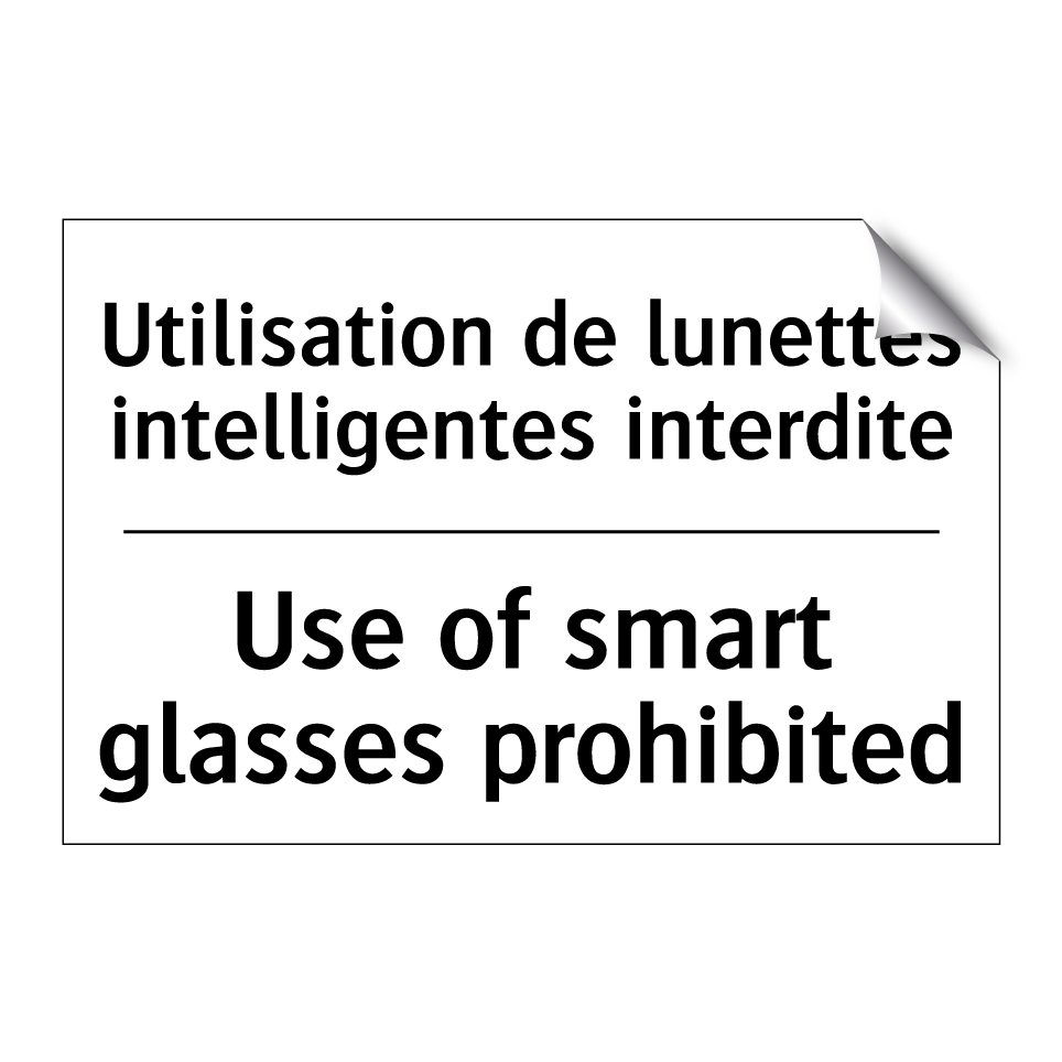 Panneau d'interdiction bilingue avec texte en français : "Utilisation de lunettes intelligentes interdite", et en anglais : "Use of smart glasses prohibited"