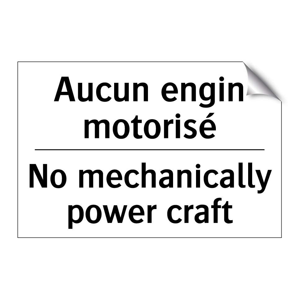 Panneau d'interdiction bilingue avec texte en français : "Aucun engin motorisé", et en anglais : "No mechanically power craft"