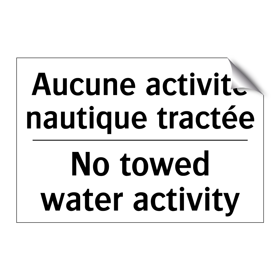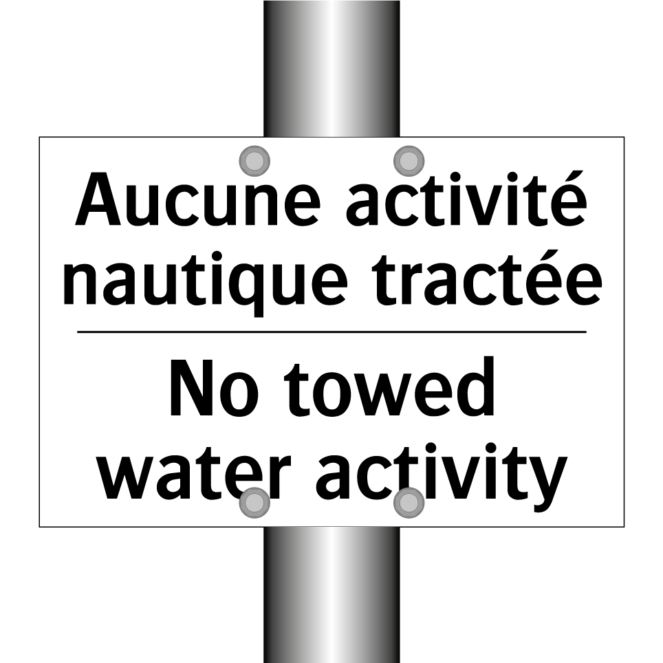 Panneau d'interdiction bilingue avec texte en français : "Aucune activité nautique tractée", et en anglais : "No towed water activity"