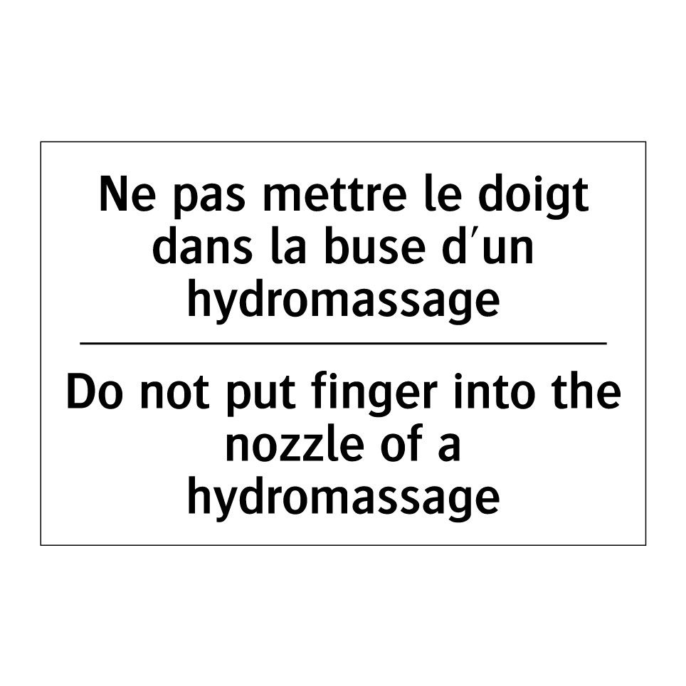 Panneau d'interdiction bilingue avec texte en français : "Ne pas mettre le doigt dans la buse d'un hydromassage", et en anglais : "Do not put finger into the nozzle of a hydromassage"