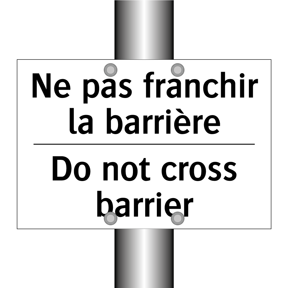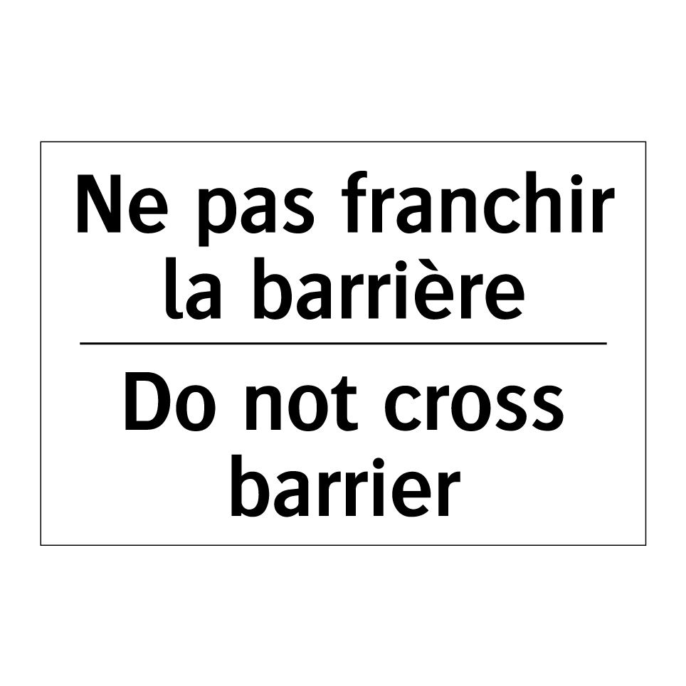 Panneau d'interdiction bilingue avec texte en français : "Ne pas franchir la barrière", et en anglais : "Do not cross barrier"