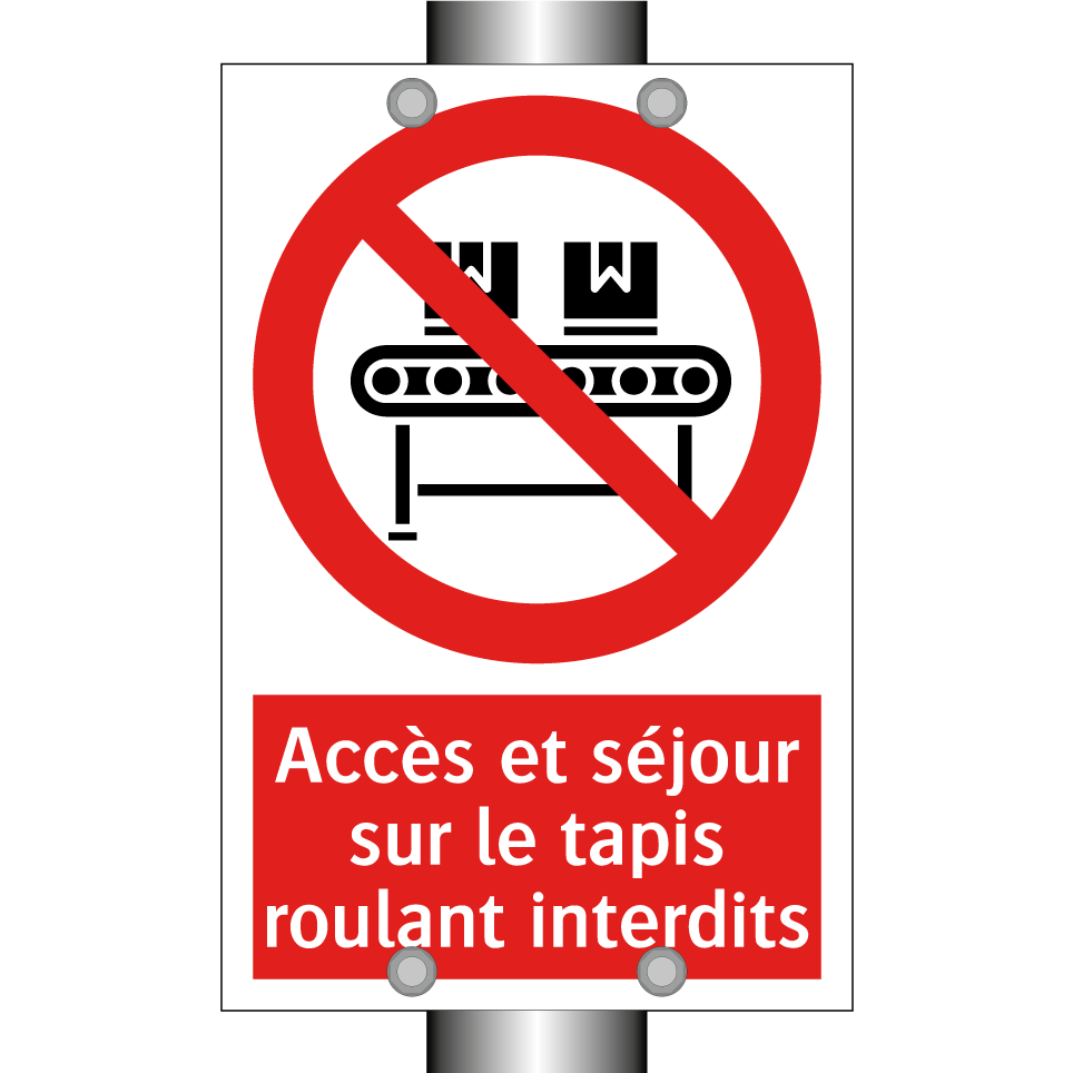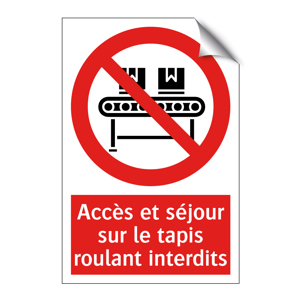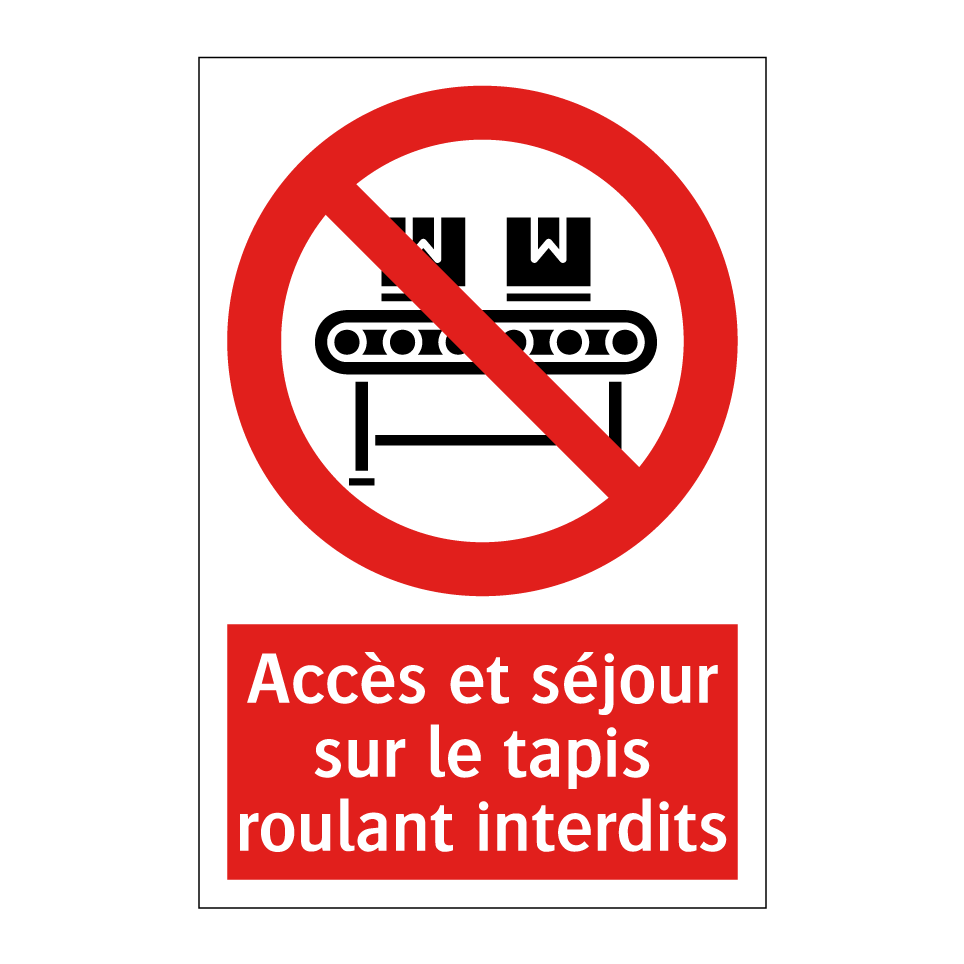 Panneau d'interdiction avec le texte : "Accès et séjour sur le tapis roulant interdits" et une symbolique claire.