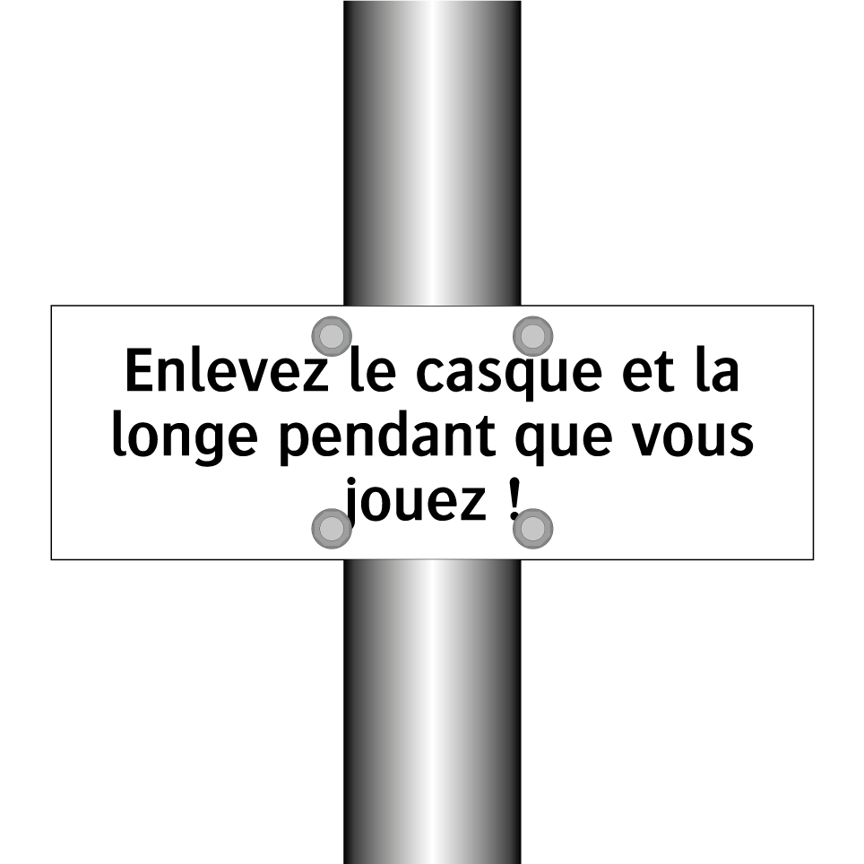 Panneau d'interdiction avec le texte : "Enlevez le casque et la longe pendant que vous jouez !"
