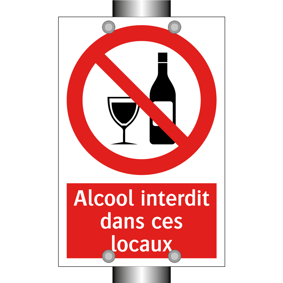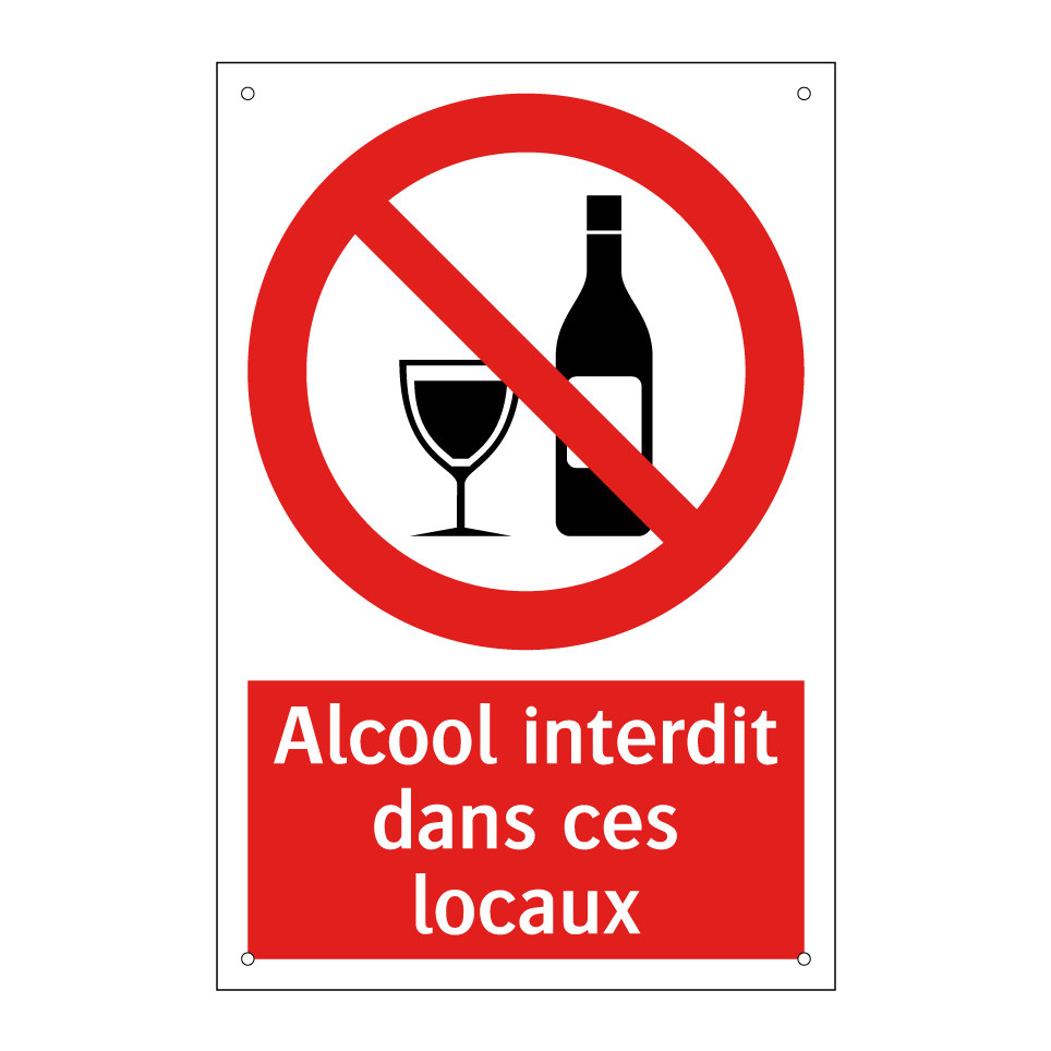 Panneau d'interdiction avec le texte : "Alcool interdit dans ces locaux" et une symbolique claire.