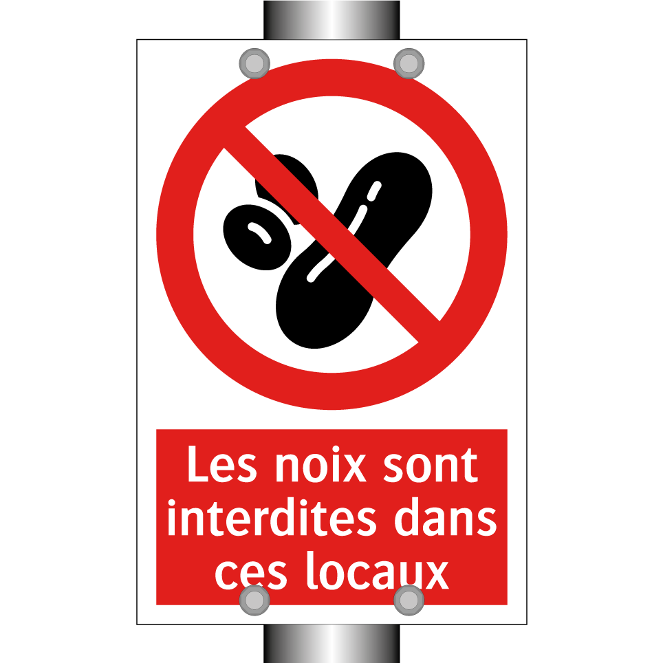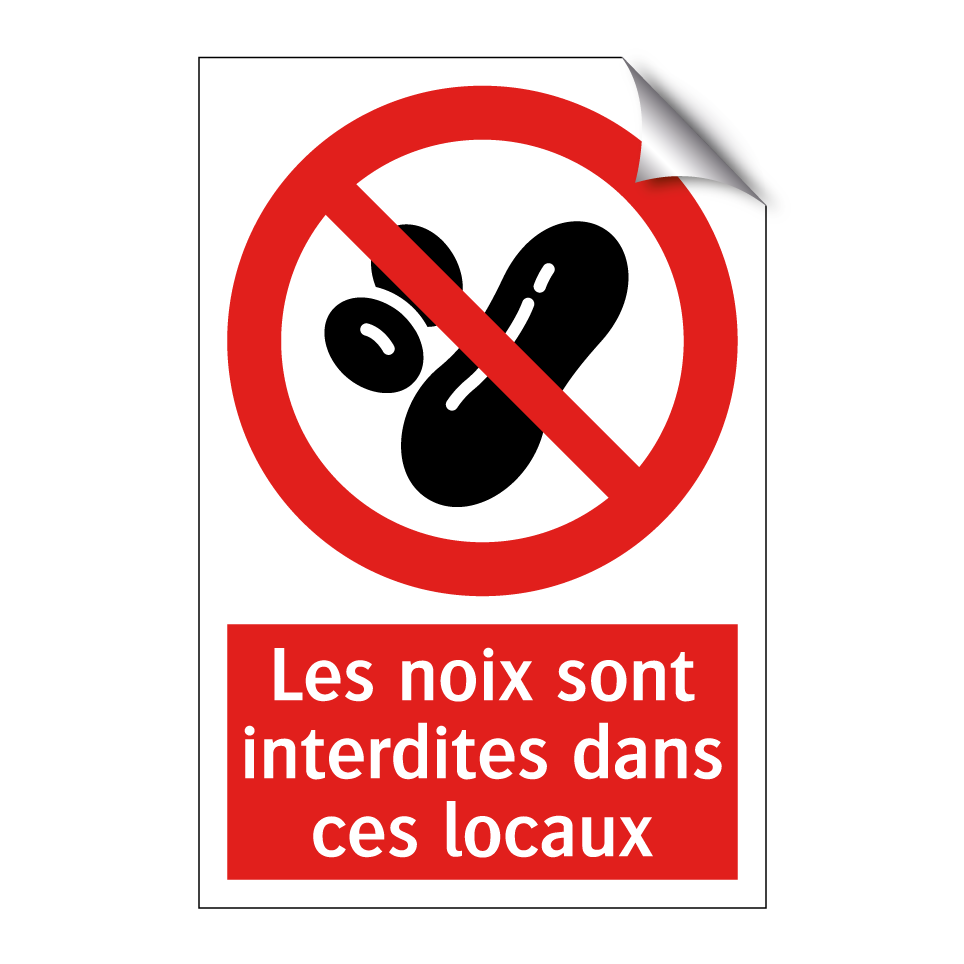 Panneau d'interdiction avec le texte : "Les noix sont interdites dans ces locaux" et une symbolique claire.