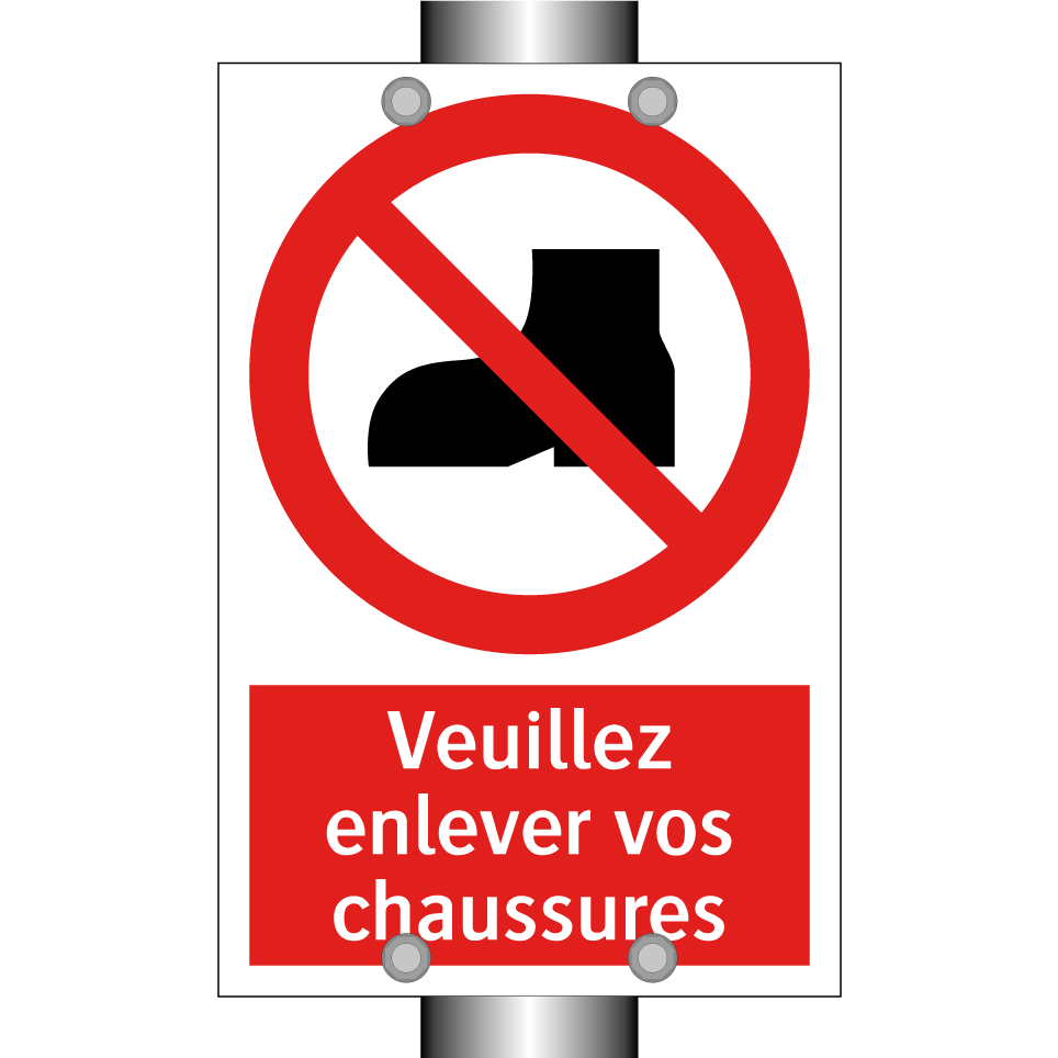 Panneau d'interdiction avec le texte : "Veuillez enlever vos chaussures" et une symbolique claire.