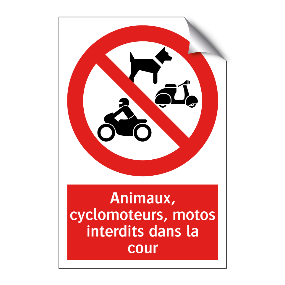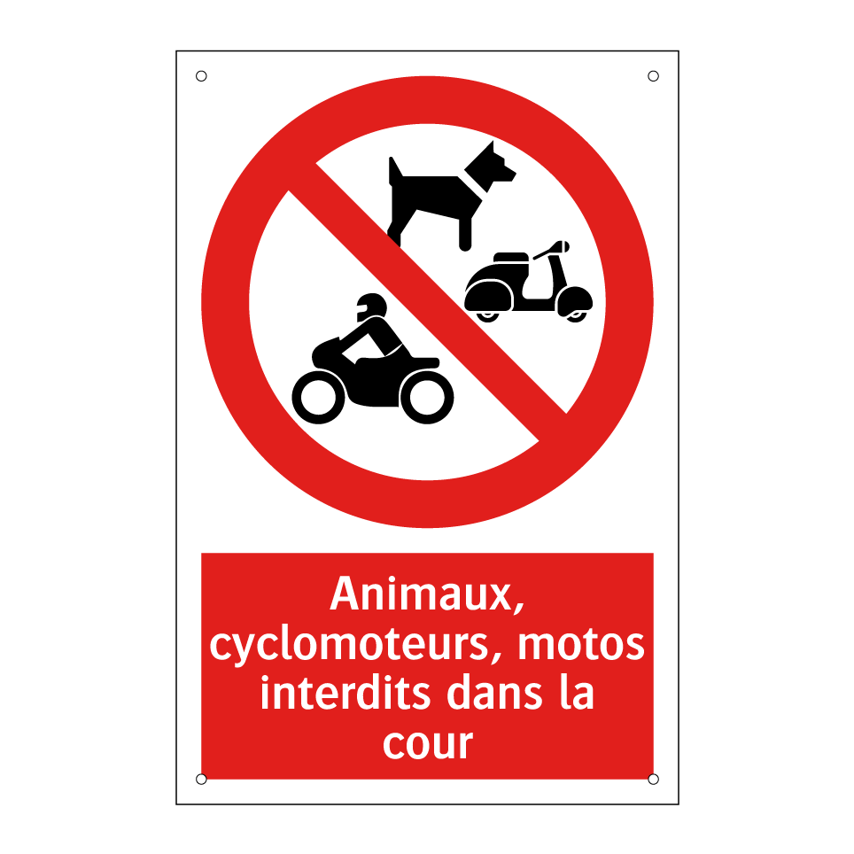 Panneau d'interdiction avec le texte : "Animaux, cyclomoteurs, motos interdits dans la cour" et une symbolique claire.