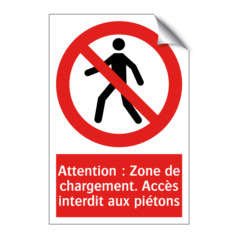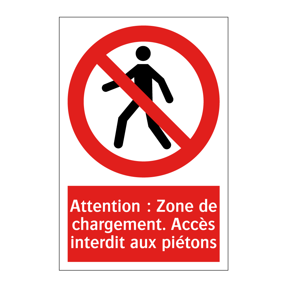 Panneau d'interdiction avec le texte : "Attention : Zone de chargement. Accès interdit aux piétons" et une symbolique claire.