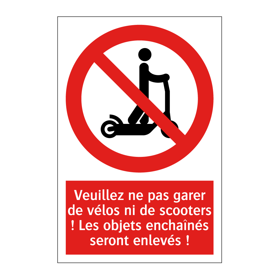 Panneau d'interdiction avec le texte : "Veuillez ne pas garer de vélos ni de scooters ! Les objets enchaînés seront enlevés !" et une symbolique claire.