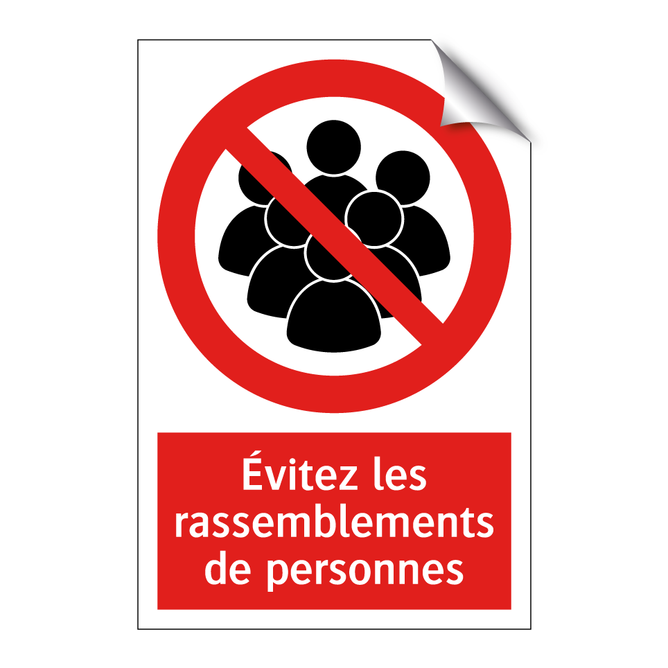 Panneau d'interdiction avec le texte : "Évitez les rassemblements de personnes" et une symbolique claire.