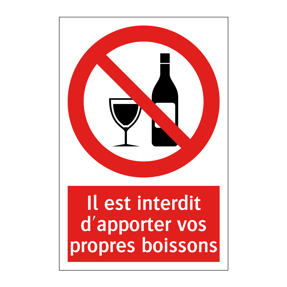 Panneau d'interdiction avec le texte : "Il est interdit d'apporter vos propres boissons" et une symbolique claire.