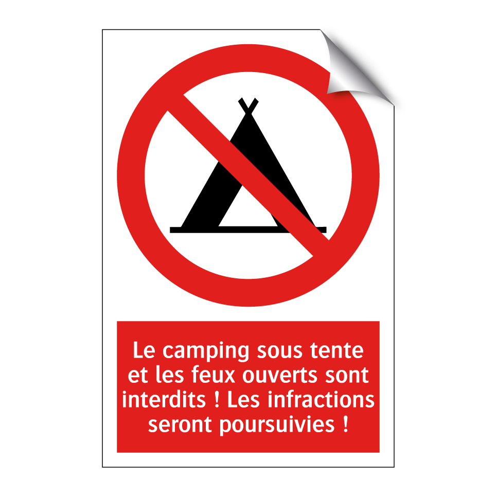 Panneau d'interdiction avec le texte : "Le camping sous tente et les feux ouverts sont interdits ! Les infractions seront poursuivies !" et une symbolique claire.
