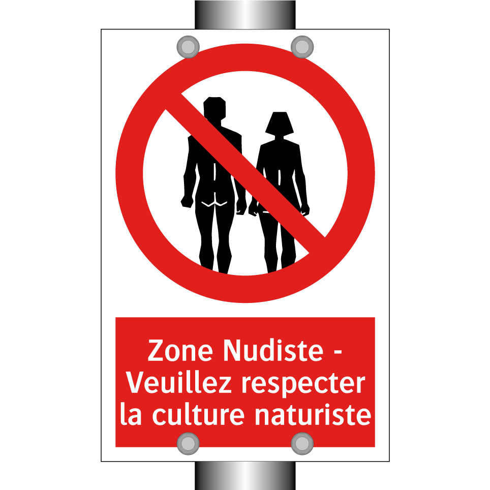 Panneau d'interdiction avec le texte : "Zone Nudiste - Veuillez respecter la culture naturiste" et une symbolique claire.