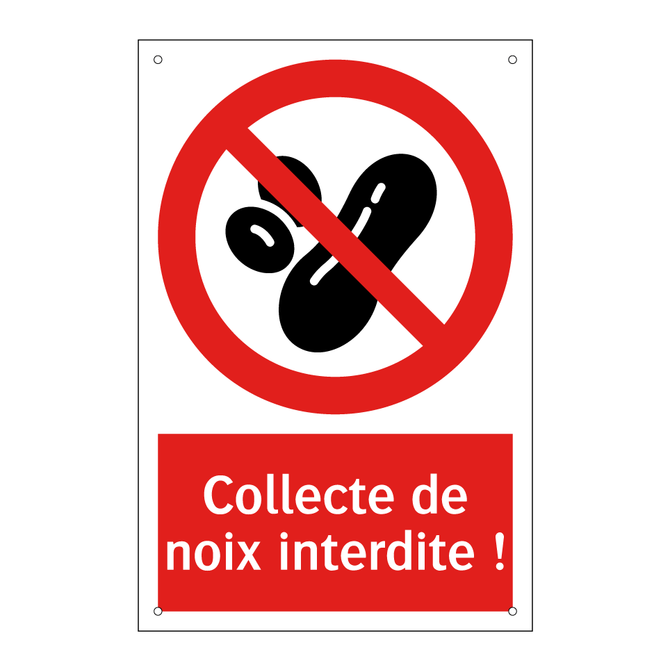 Panneau d'interdiction avec le texte : "Collecte de noix interdite !" et une symbolique claire.