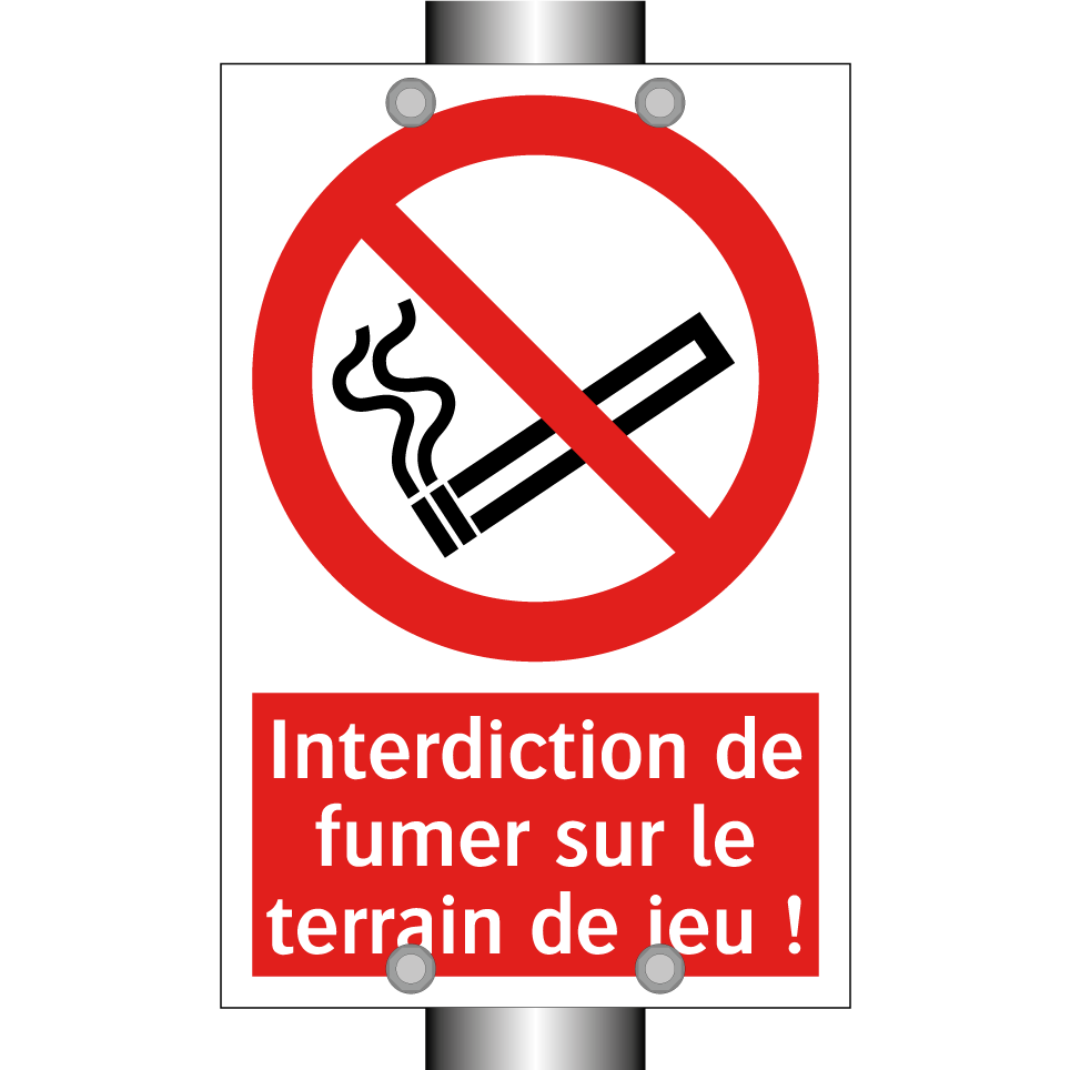 Panneau d'interdiction avec le texte : "Interdiction de fumer sur le terrain de jeu !" et une symbolique claire.
