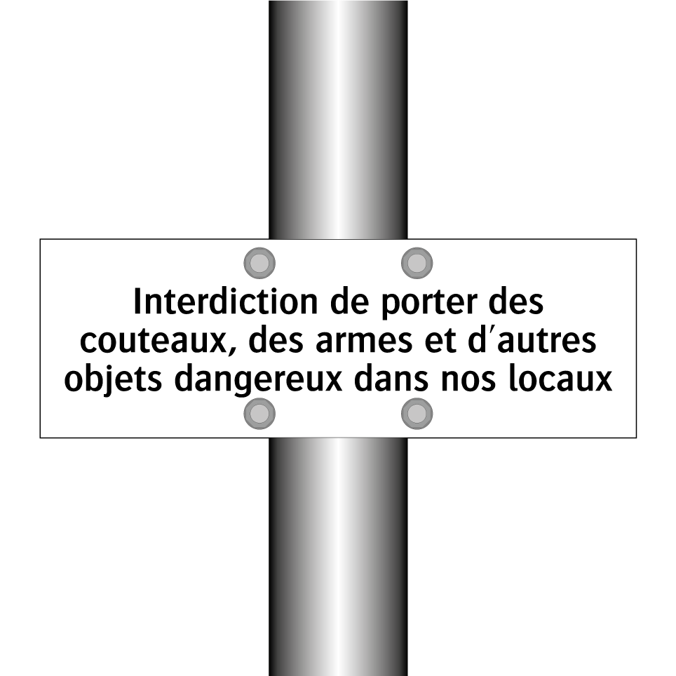 Panneau d'interdiction avec le texte : "Interdiction de porter des couteaux, des armes et d'autres objets dangereux dans nos locaux"