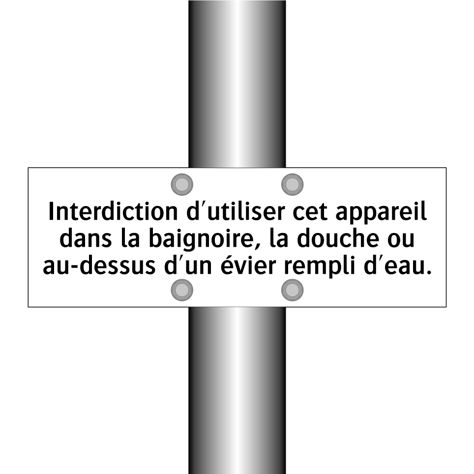 Panneau d'interdiction avec le texte : "Interdiction d'utiliser cet appareil dans la baignoire, la douche ou au-dessus d'un évier rempli d'eau."
