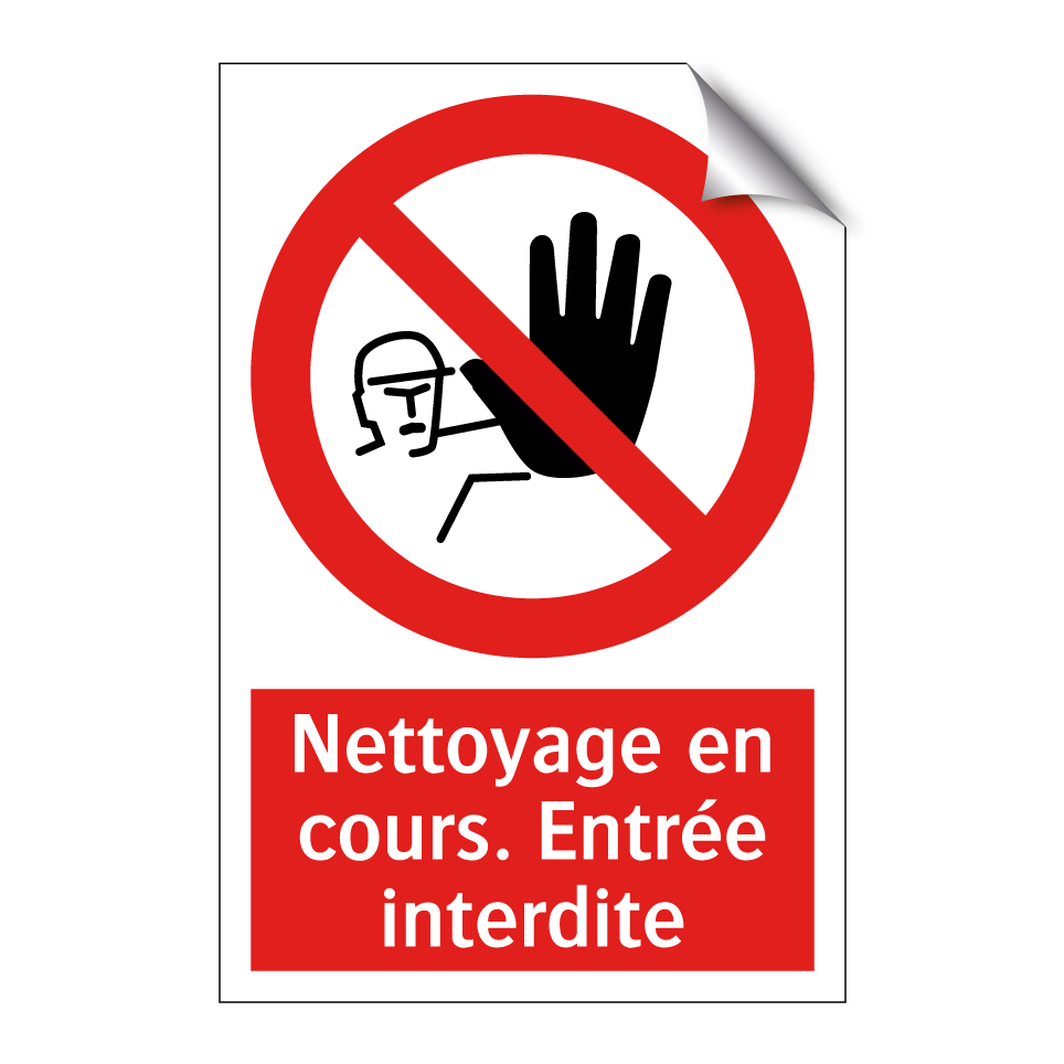 Panneau d'interdiction avec le texte : "Nettoyage en cours. Entrée interdite" et une symbolique claire.